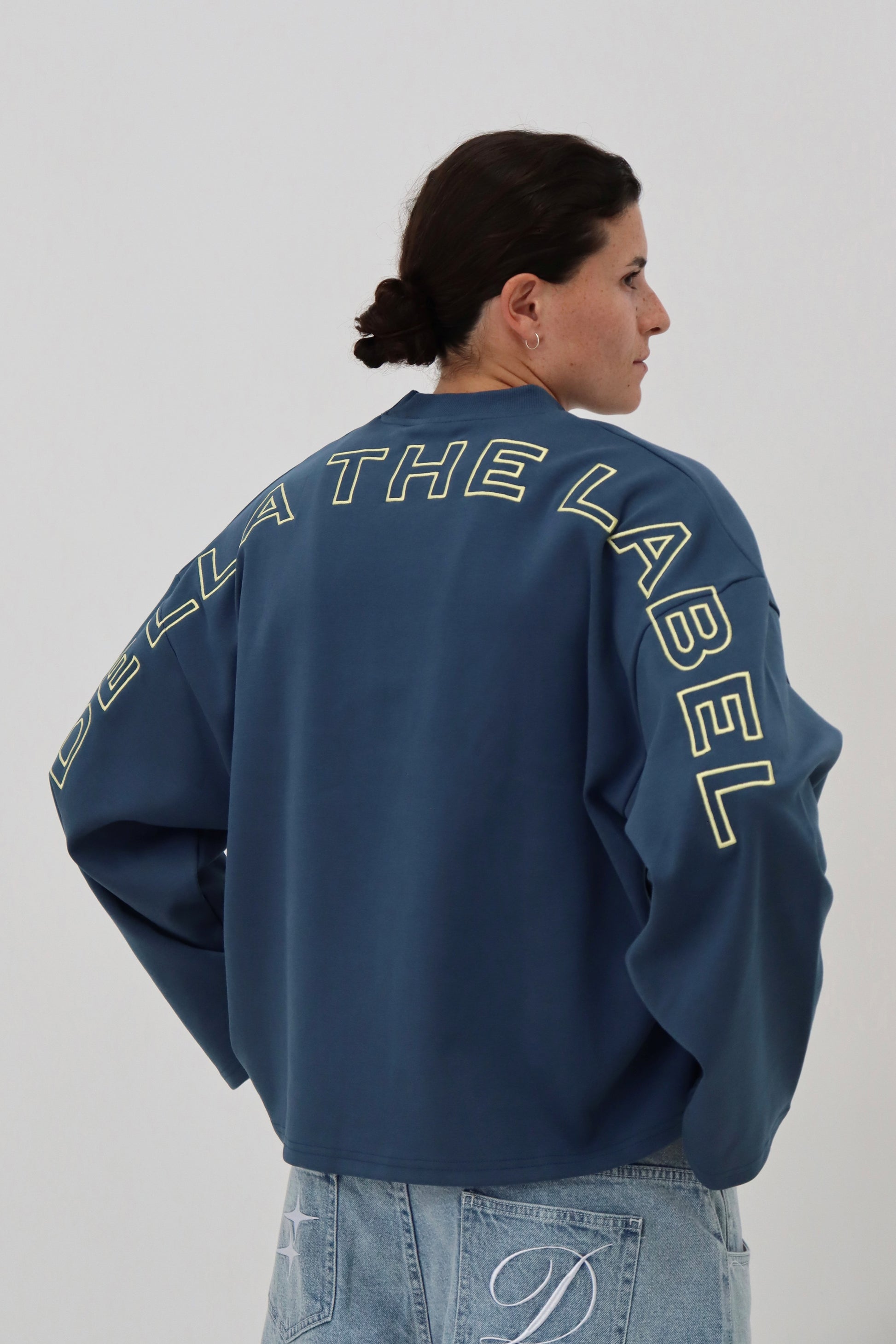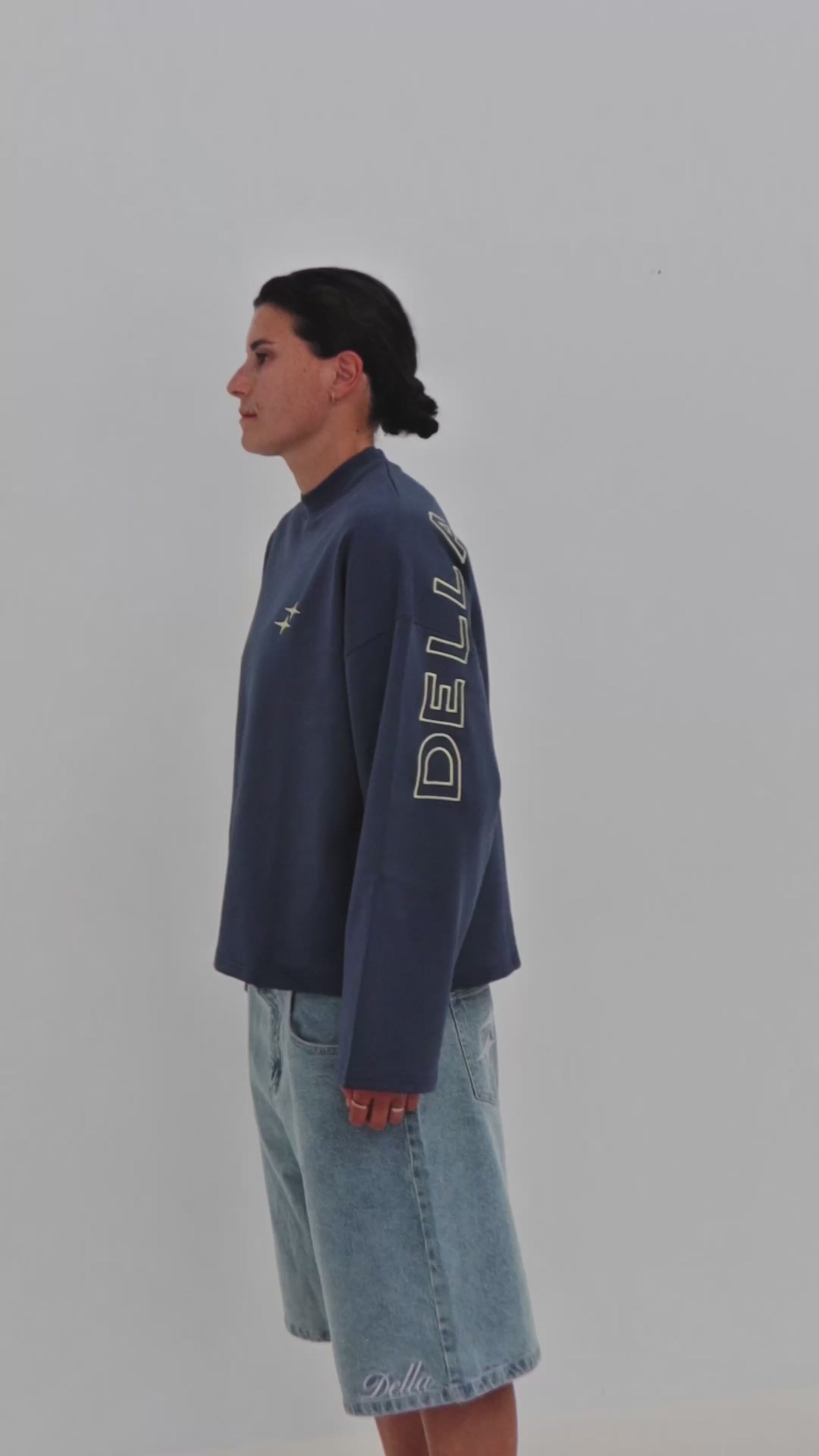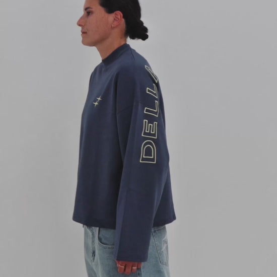 Following the sold-out success of the previous long sleeve, this navy T-shirt is crafted from heavy-weight cotton and delivers equal statement appeal. Featuring a high neckline, boxy fit, and cropped hem, it offers a modern, relaxed silhouette. Statement ‘Della The Label’ embroidery spans the rear and sleeves, complemented by a subtle star on the front.